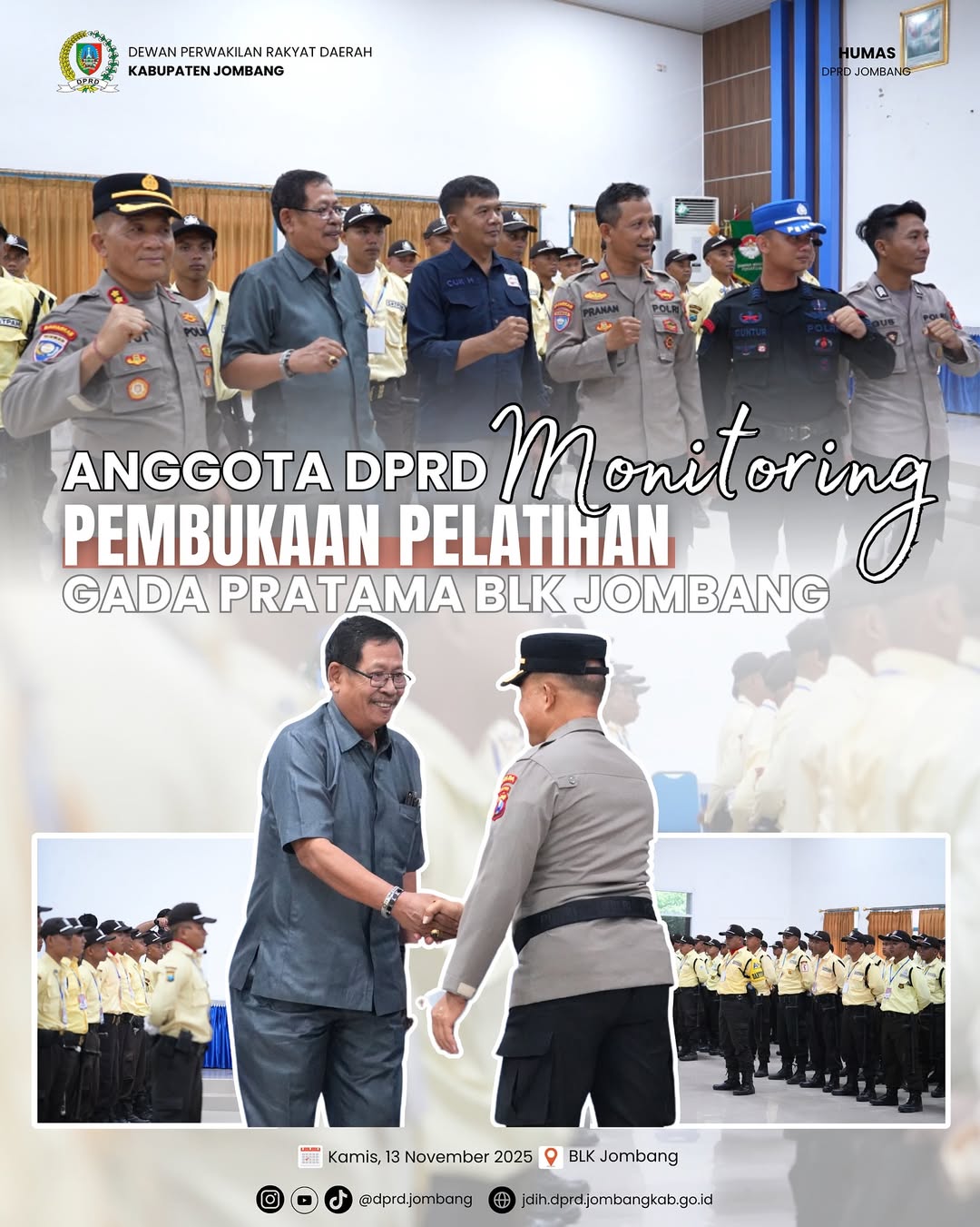Anggota DPRD Kabupaten Jombang, Bapak Subur, melaksanakan kegiatan monitoring pada pembukaan Pelatihan Gada Pratama yang digelar di Balai Latihan Kerja (BLK) Jombang pada Kamis, 13 November 2025. Kegiatan ini merupakan bagian dari upaya pemerintah daerah dalam meningkatkan kompetensi dan profesionalisme tenaga satuan pengamanan di Kabupaten Jombang.