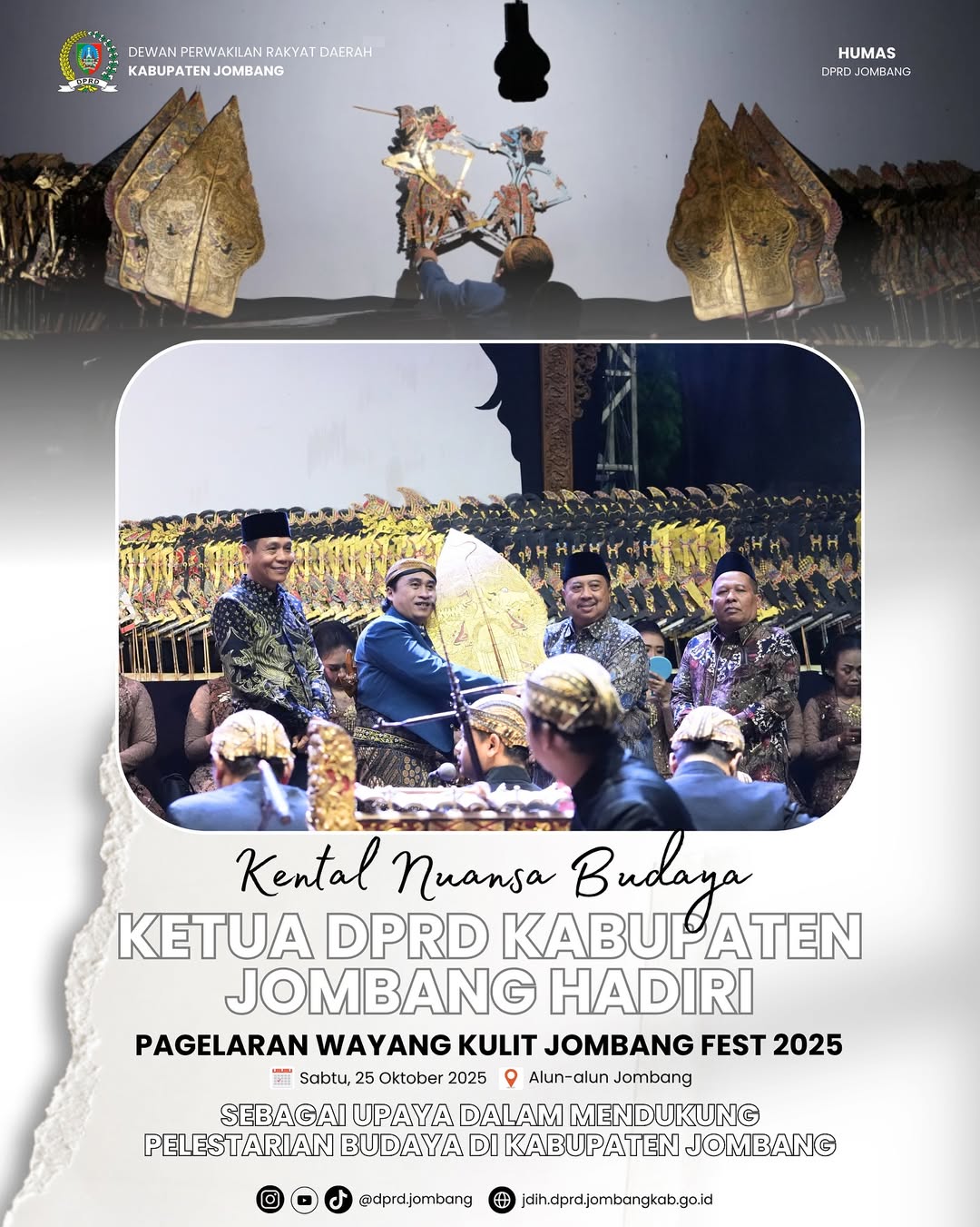 Ketua DPRD Kabupaten Jombang menghadiri gelaran wayang kulit yang menjadi salah satu rangkaian kegiatan Jombang Fest 2025. Pagelaran yang digelar di area Alun-Alun Jombang ini berlangsung meriah dan mendapat sambutan antusias dari masyarakat.