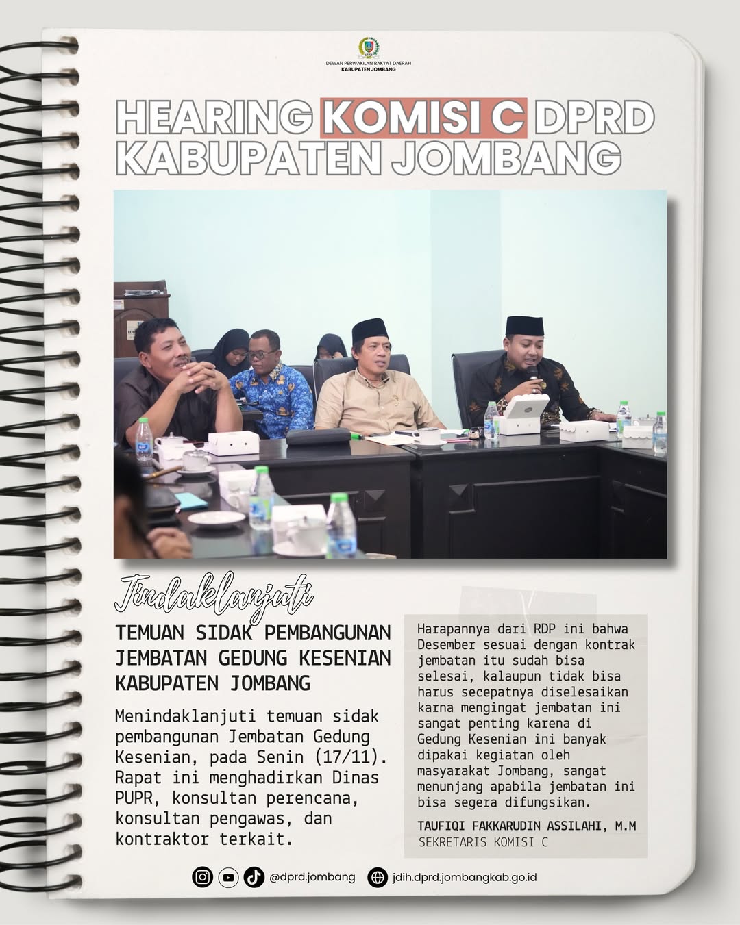 Harapannya dari RDP ini bahwa Desember sesuai dengan kontrak jembatan itu sudah bisa selesai, kalaupun tidak bisa harus secepatnya diselesaikan karna mengingat jembatan ini sangat penting karena di Gedung Kesenian ini banyak dipakai kegiatan oleh masyarakat Jombang, sangat menunjang apabila jembatan ini bisa segera difungsikan, Disampaikan Sekretaris Komisi C Bapak Taufiqi Fakkarudin Assilahi, M.M.