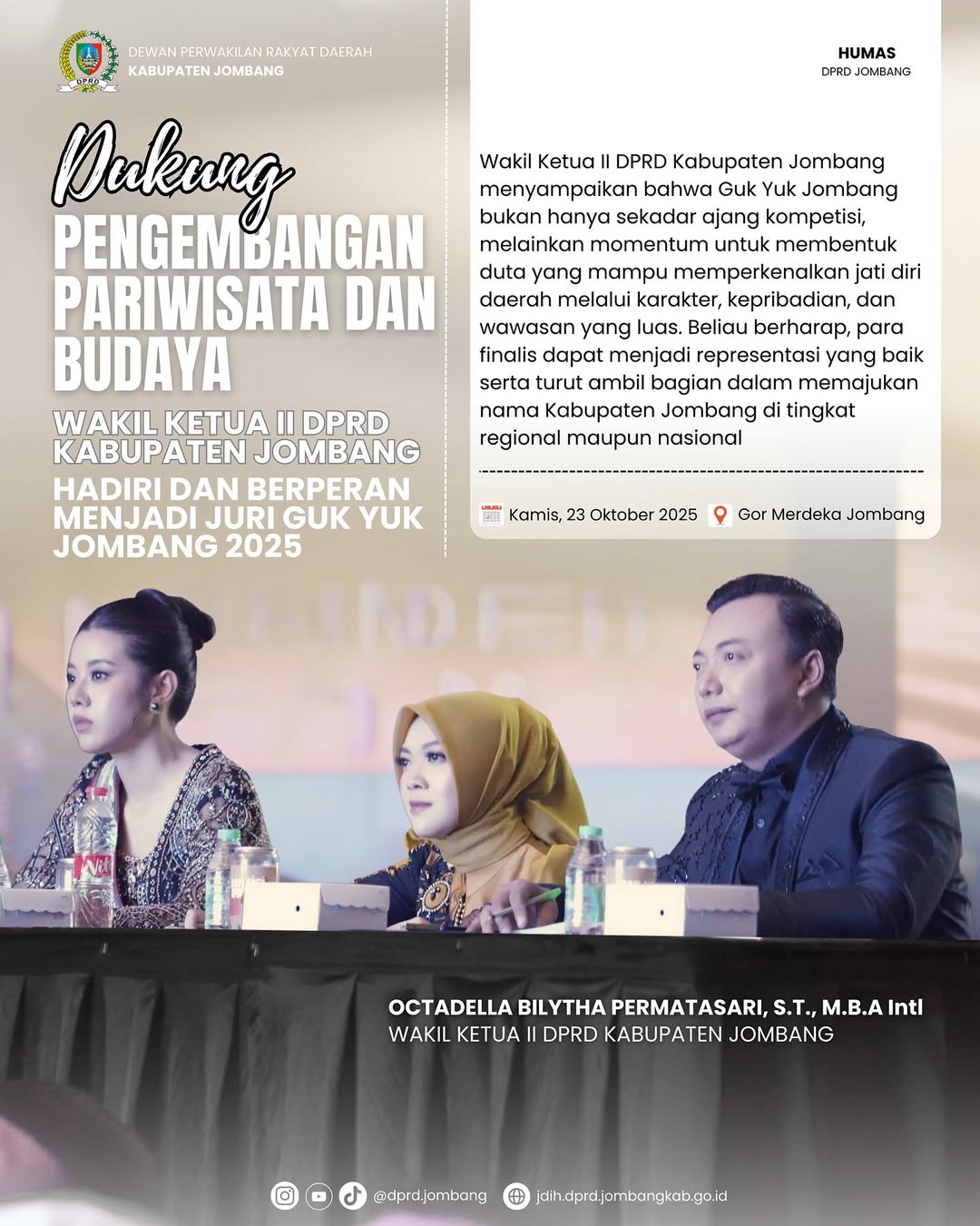 Suasana penuh semangat dan kebanggaan terasa dalam Grand Final Guk Yuk Jombang 2025. Di tengah antusiasme para finalis, Wakil Ketua II DPRD Kabupaten Jombang, hadir tidak hanya sebagai tamu kehormatan, tetapi juga sebagai salah satu juri yang menilai potensi dan karakter para peserta.