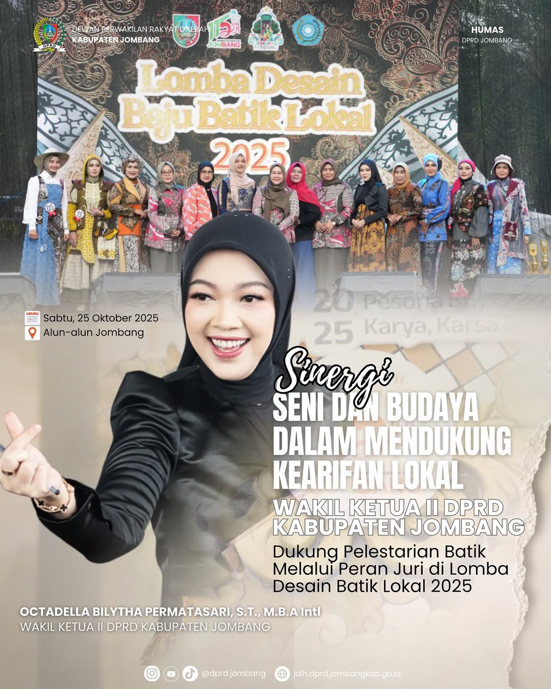 Wakil Ketua II DPRD Kabupaten Jombang, menghadiri sekaligus menjadi juri dalam Lomba Desain Baju Batik Lokal 2025 yang merupakan salah satu rangkaian kegiatan Jombang Fest 2025. Kegiatan yang digelar di area Alun-Alun Jombang tersebut diikuti oleh para pelajar, komunitas kreatif, hingga desainer muda dari berbagai kecamatan di Kabupaten Jombang.